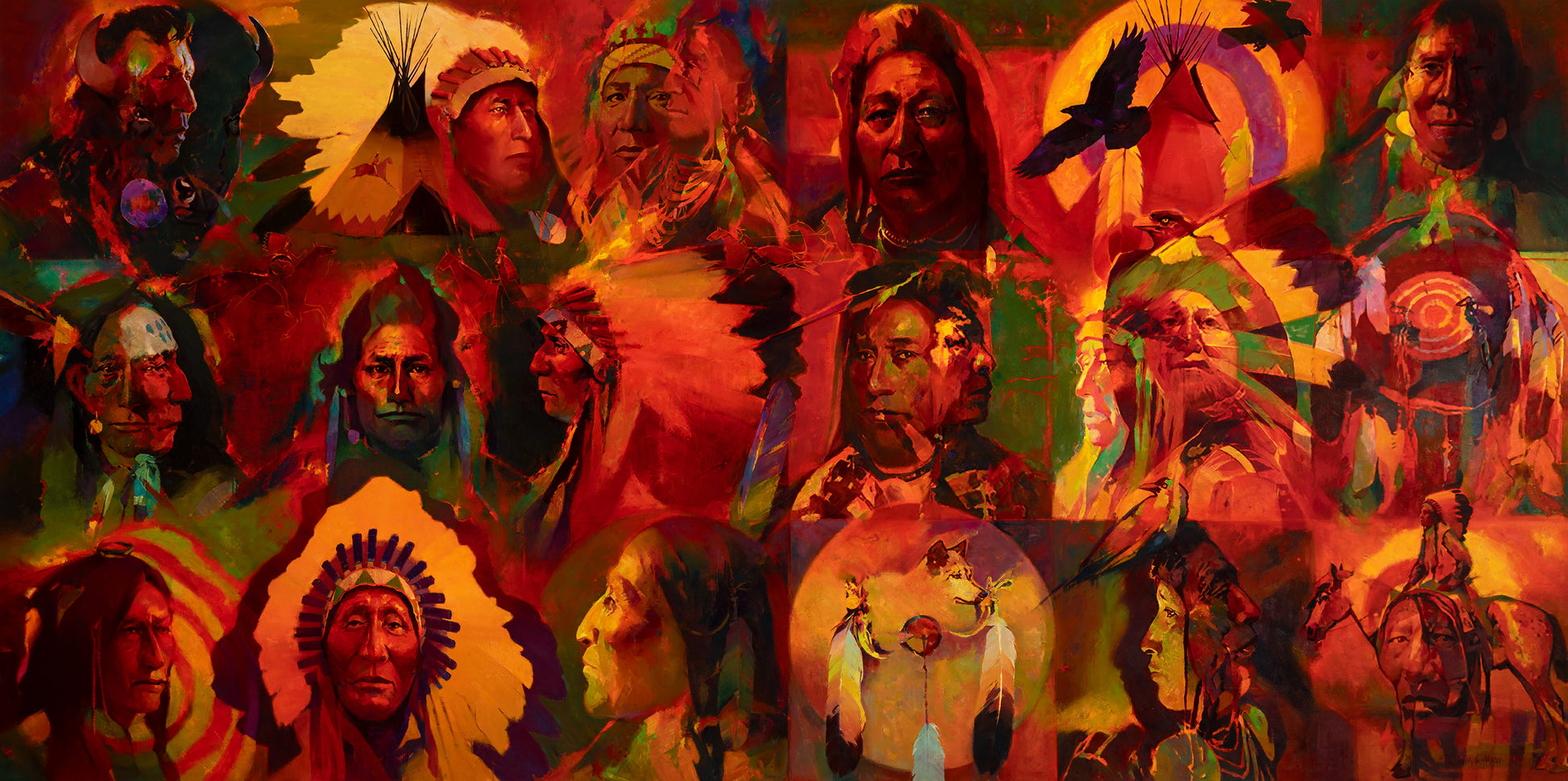 Evolving Evolution reflects both the ongoing evolution of the tribe and the painting’s own dynamic process of becoming. Described by Tom Gilleon as the busiest work he has ever created, the piece resembles a kaleidoscope—rewarding viewers with new details the longer they engage with it. Comprised of two sets of nine panels, a format that has become a signature in Gilleon’s work, Evolving Evolution stands as one of his lifetime masterpieces.