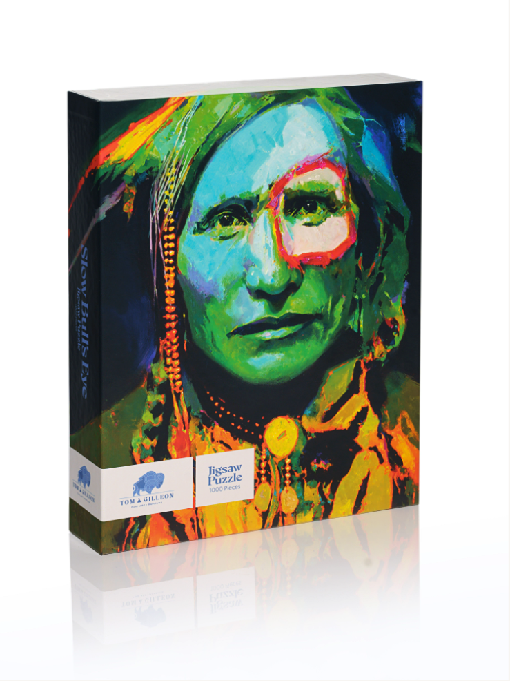 Our 1,000-piece Tom Gilleon Jigsaw Puzzles offer you the opportunity to assemble stunning reproductions of one of the artist’s finest museum-quality paintings: Slow Bull’s Eye.